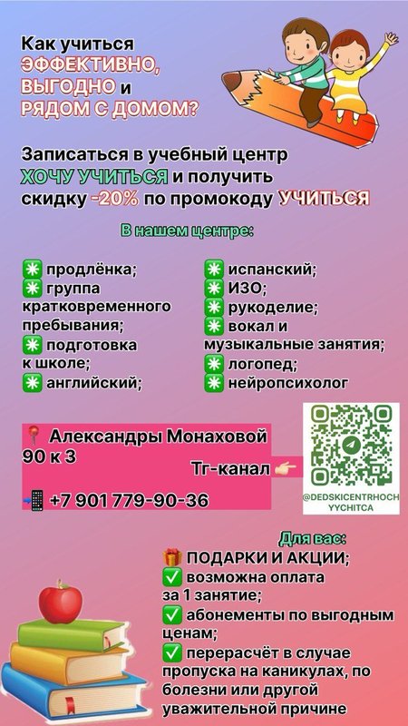 Здесь с любовью развивают интеллект ребятишек и готовят их к самостоятельной жизни в новой информационной эпохе. Педагоги не просто занимаются адаптацией к детскому саду и школе, уча разным навыкам и техникам социализации. Именно после таких занятий дети начинают осознавать себя как самостоятельные личности и уже в нежном детстве начинают осознавать, чем хотят заниматься в будущем. Дети - это наше будущее, а значит, им стоит отдавать все самое лучшее. Детский центр Хочу учиться представляет собой проверенное место, где готовы развивать способности ваших детей, обучать их навыкам коммуникаций, нести идею настоящей дружбы, а также учить их не избегать всех препятствий, которые могут встретиться в жизни.